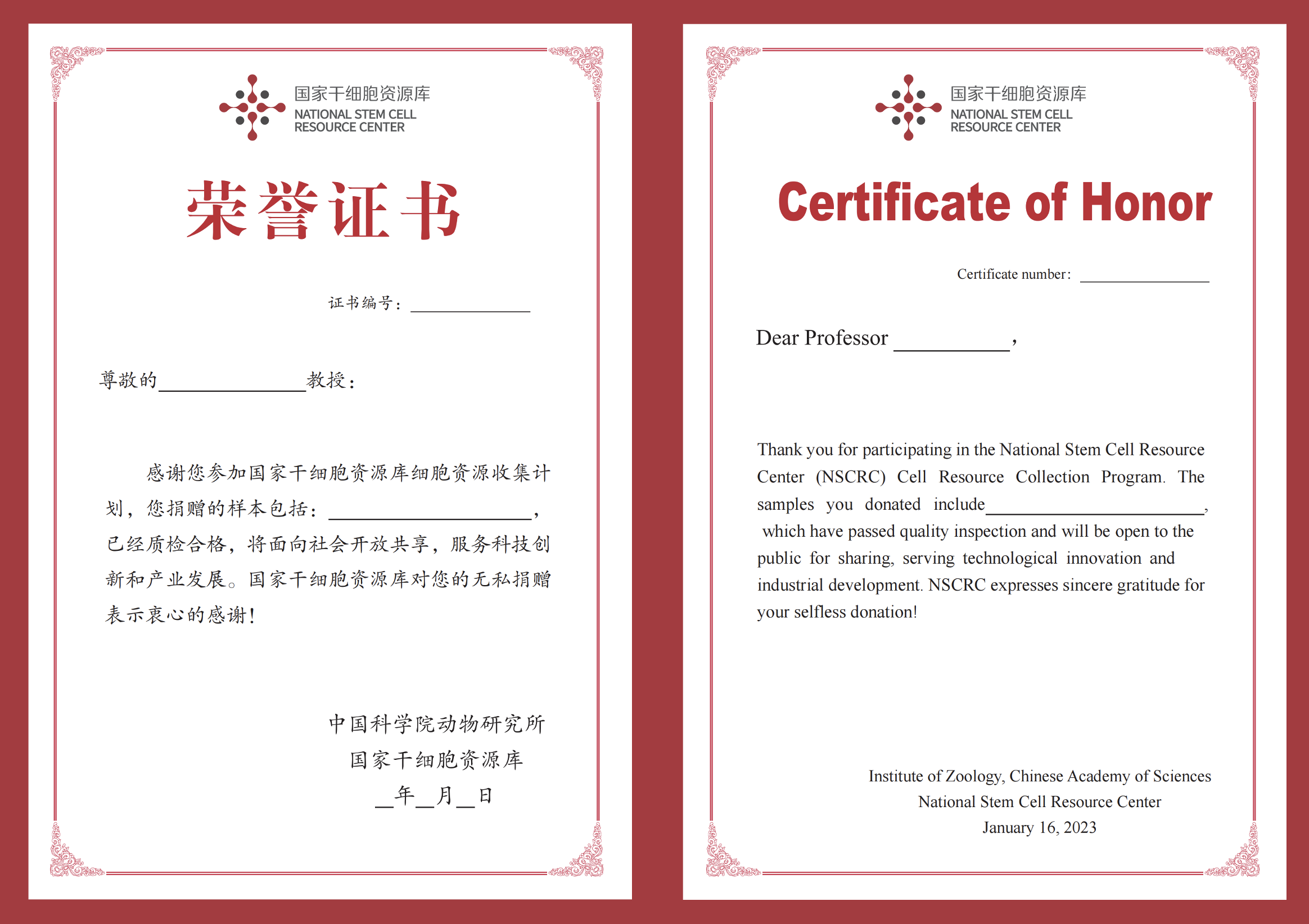 若您团队的细胞等生物资源通过检测被国家干细胞资源库收集入库,我们将为您颁发荣誉证书(图1)。